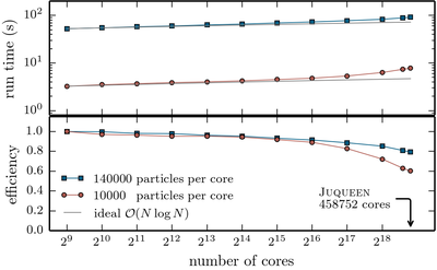 PEPC itself is written in Fortran 2003 with some C wrappers for POSIX functions. In addition to the main pthreads-parallelised tree traversal, a version based on OpenMP is available and there has also been a version using SMPSs. Besides the hybrid parallelisation, a number of improvements to the original Warren-Sallmon ‘hashed oct-tree’ scheme have been included and allow for an excellent scaling of the code on different architectures with up to 2,048,000,000 particles across up to 294,912 processors (at the then largest machine at JSC: JUGENE).